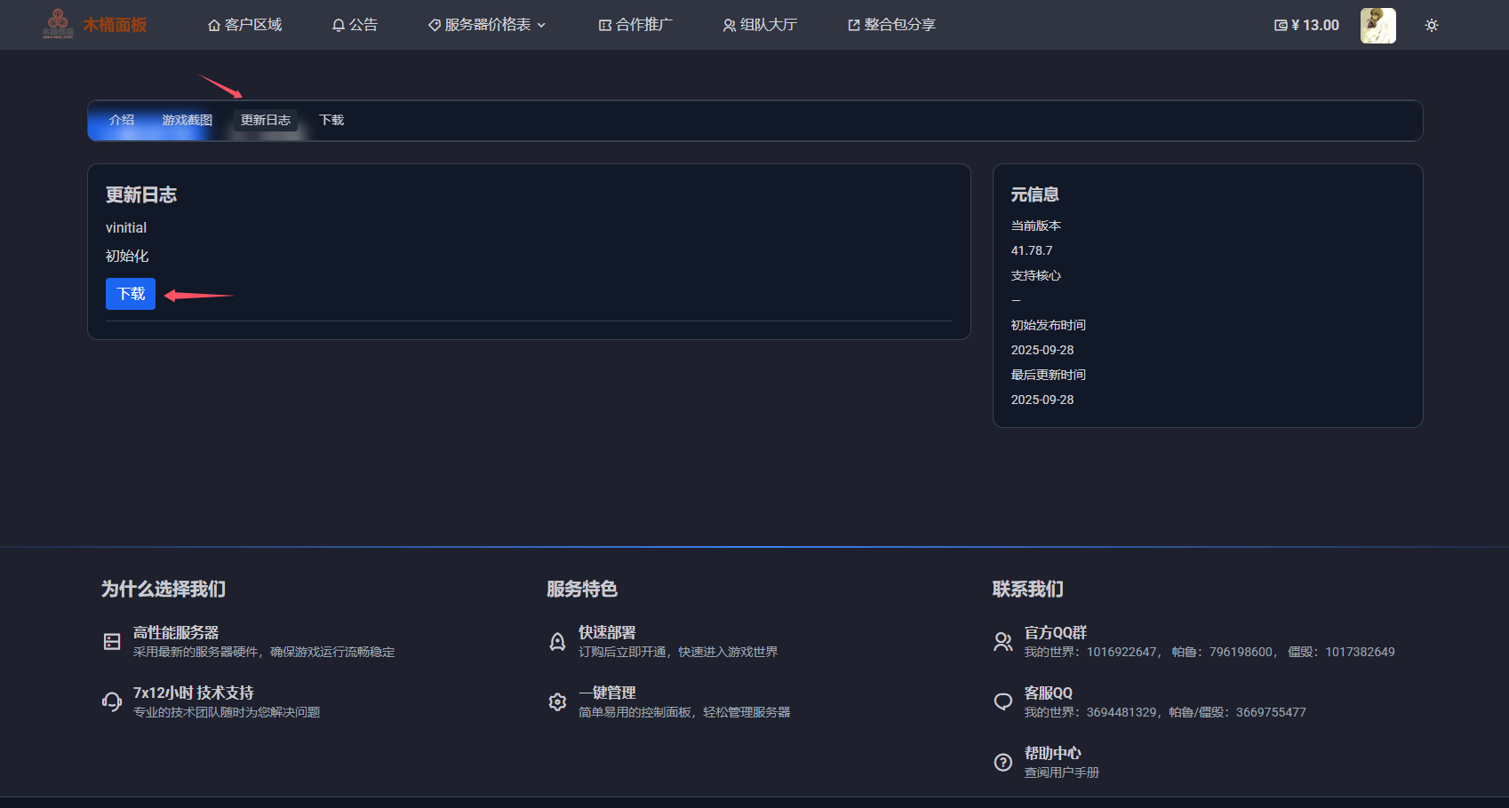 ☕登录客户区域,获取配置文件1.前往面板官网登录,进入整合包分享2.查看已分享的配置文件,右边会有标签,可以勾选感兴趣的类型检索3.打开感兴趣的配置文件,点击更新日志→下载🎍上传下载的配置文件到服务器打开自己的面板后台,进入文件栏,用刚刚下载的配置文件替换原有的配置文件,检查开服教程里的反作弊与自动备份是否关闭😈提示:配置文件的名称需要和服务器的名称对应,否则不生效,开服会生成原版配置文件作者:sasami 创建时间:2025-09-28 09:06最后编辑:admin 更新时间:2025-09-28 10:14