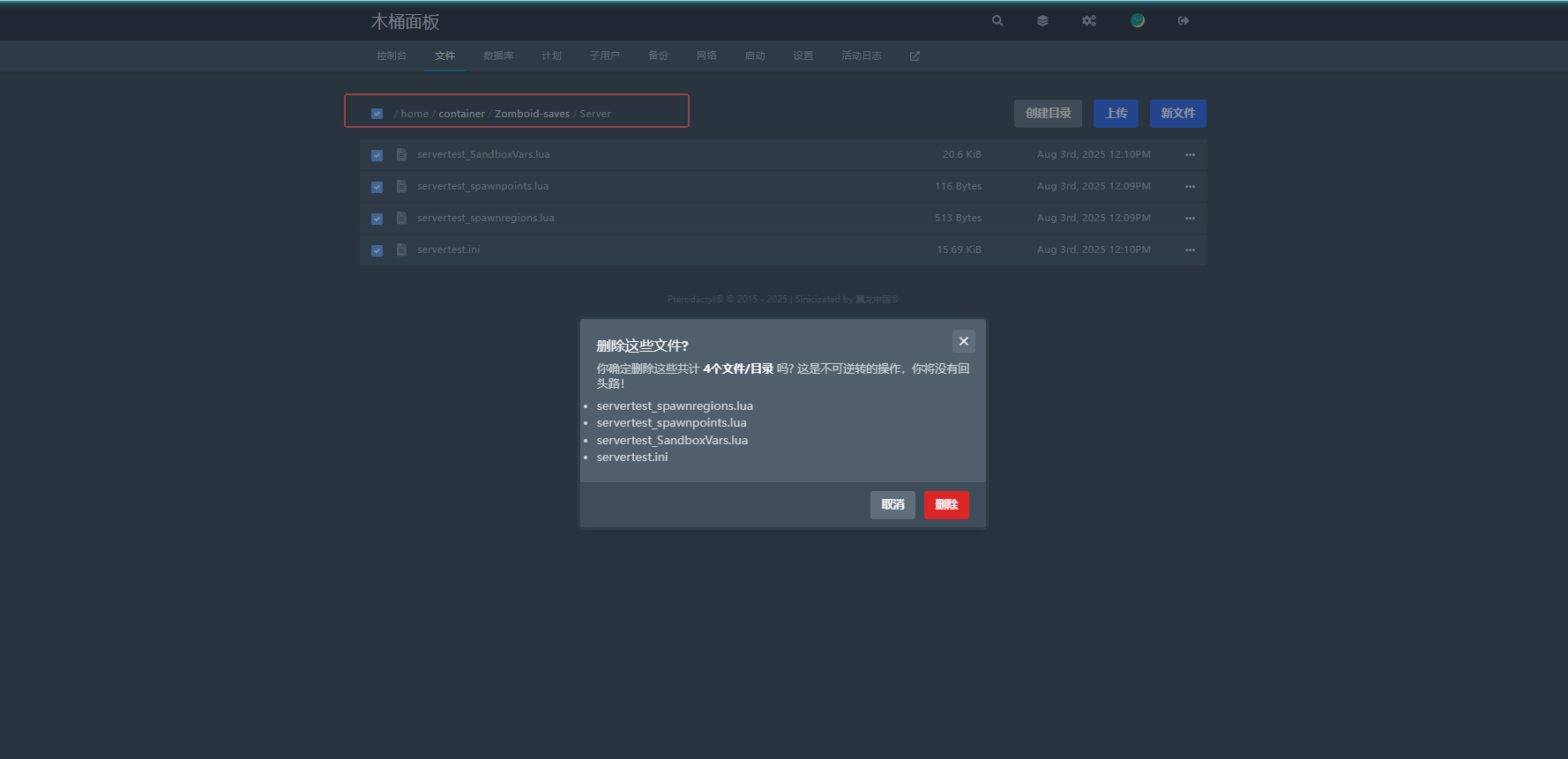 目录 搜索 展开 木桶面板用户手册付款/创建及登录面板账户更换预设分享自己的配置文件使用分享的配置文件开服 暂无相关搜索结果! 阅读次数:93 本文档使用 MinDoc 发布 使用分享的配置文件开服 ☕登录客户区域,获取配置文件1.前往面板官网登录,进入整合包分享2.查看已分享的配置文件,右边会有标签,可以勾选感兴趣的类型检索3.打开感兴趣的配置文件,点击更新日志→下载🎍上传下载的配置文件到服务器打开自己的面板后台,进入文件栏,用刚刚下载的配置文件替换原有的配置文件,检查开服教程里的反作弊与自动备份是否关闭😈提示:配置文件的名称需要和服务器的名称对应,否则不生效,开服会生成原版配置文件作者:sasami 创建时间:2025-09-28 09:06最后编辑:admin 更新时间:2025-09-28 10:14